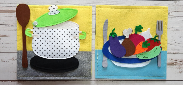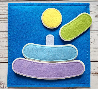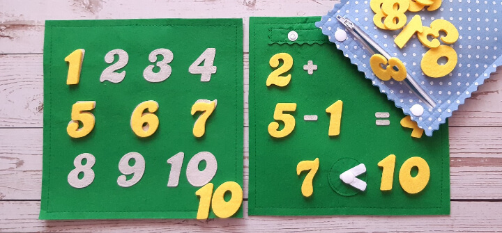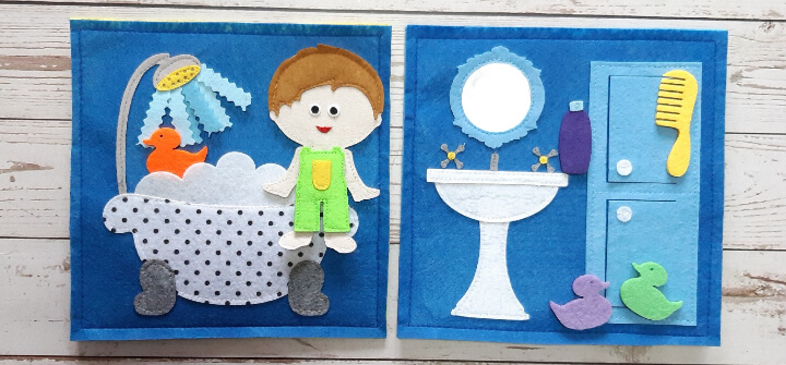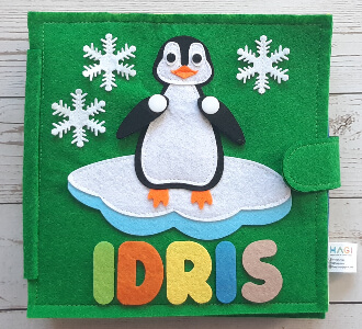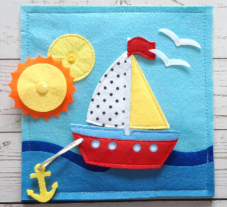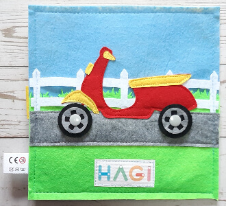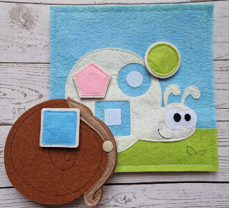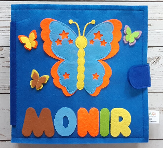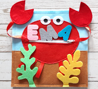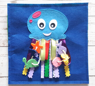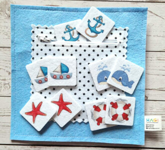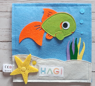 Kit sa rajsferšlusom i pet ribica unutra – Ova stranica nudi mnoštvo taktilnih aktivnosti, dok otvaranje rajsferšlusa potiče finu motoriku i spretnost ruku. Ribice dodatno razvijaju senzornu stimulaciju, i osnov su upoznavanja sa brojevima.