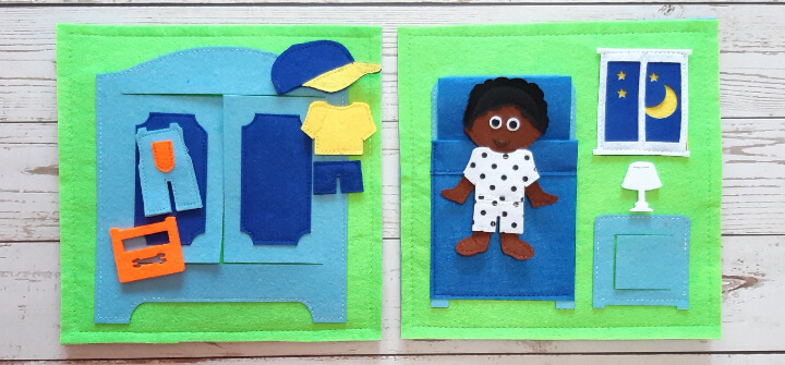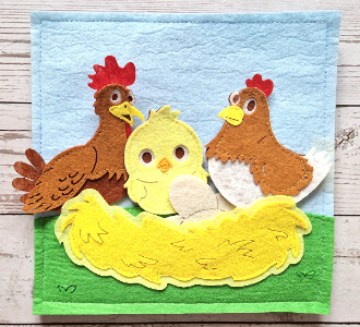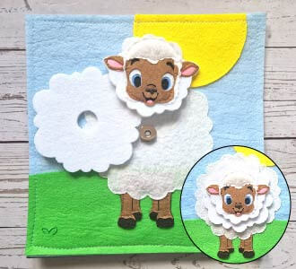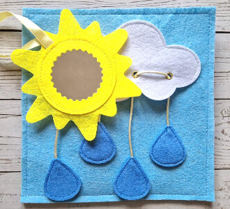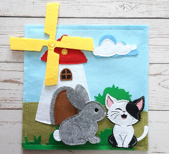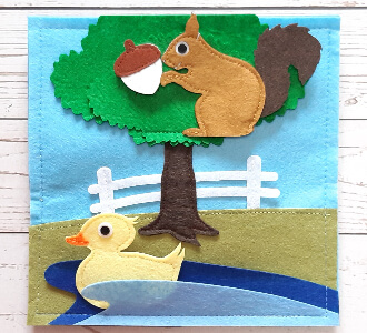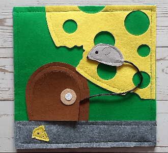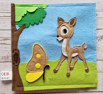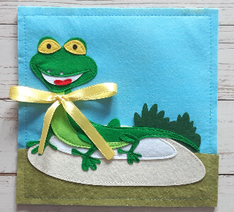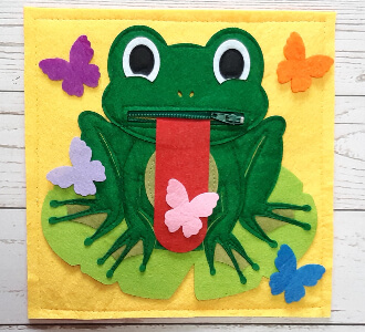 Žaba sa rajsferšlusom i pet leptirića unutra – Djeca uživaju u otkrivanju skrivenih elemenata, dok razvijaju spretnost ruku otvaranjem i zatvaranjem rajsferšlusa. Leptirići donose dodatnu vizualnu i taktilnu stimulaciju.