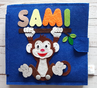 Majmun sa nogama koje se mogu skidati (plastični drikeri) – Vesela stranica koja podstiče djecu na aktivno učešće, razvijajući njihovu spretnost i logičko razmišljanje. Senzorni elementi doprinose boljoj percepciji oblika i tekstura, dok kačenje nogu vježba koordinaciju i razumijevanje uzročno-posljedičnih odnosa.