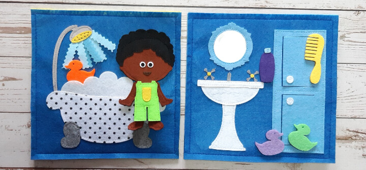 Dječak u kupatilu i navike lične higijene. Ormar sa češljem i šamponom, i dvije male patkice – Ova stranica pomaže djeci da razviju svijest o važnosti higijene kroz igru sa dječakom i njegovim toaletnim potrepštinama. Djeca kroz ovo iskustvo uče kako održavati higijenu, što potiče razvoj svakodnevnih navika.