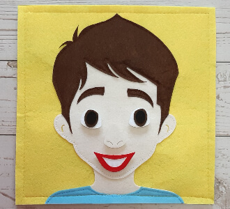 Lice dječaka sa pokretnim dijelovima lica – oči, nos i usta (čičak) – Ova stranica je savršena za razvijanje dječije sposobnosti da prepoznaju izraze lica i razviju motoričke vještine kroz igru sa čičkom.