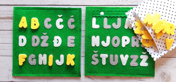 Latinična abeceda na našem jeziku sa 30 slova plus 15 dodatnih najčešćih slova za kombinovanje različitih riječi. Ova stranica podstiče rano učenje abecede i sklapanje prvih riječi. Savršena za razvoj pismenosti.