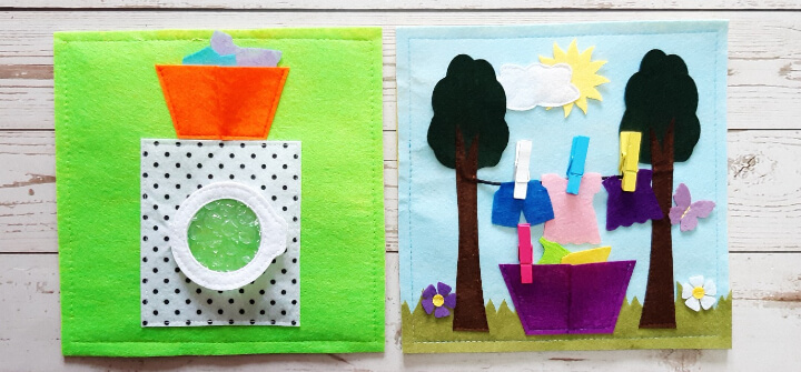 Mašina za pranje veša i konopac za sušenje veša sa drvenim štipaljkama – Ova stranica pruža djeci priliku da kroz igru uloga oponašaju svakodnevne poslove odraslih, poput pranja i sušenja veša, čime razvijaju osjećaj odgovornosti i važnosti doprinosa kućnim obavezama. Korištenje drvenih štipaljki zahtijeva preciznost i snagu prstiju, što doprinosi razvoju fine motorike, koordinacije ruku i očiju te jačanju snage u šaci.