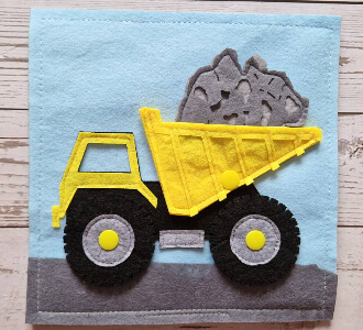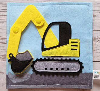 Bager sa "kašikom" koja se rastavlja (plastični drikeri) – Interaktivna stranica koja podstiče radoznalost o građevinskim mašinama, dok skidanje i vraćanje dijelova jača djetetovu preciznost i pažnju.