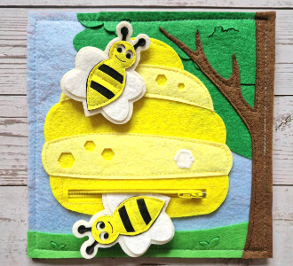 Košnica sa rajsferšlusom i dvije pčelice (Čičak) – Upoznavanje sa svijetom pčela na način koji razvija dječiju znatiželju, dok rad sa rajsferšlusom i pčelicama pomaže u finim motoričkim vještinama. Pčelice je moguće ubaciti unutar košnice, a potom ih je potrebno zakačiti na pravo mjesto.