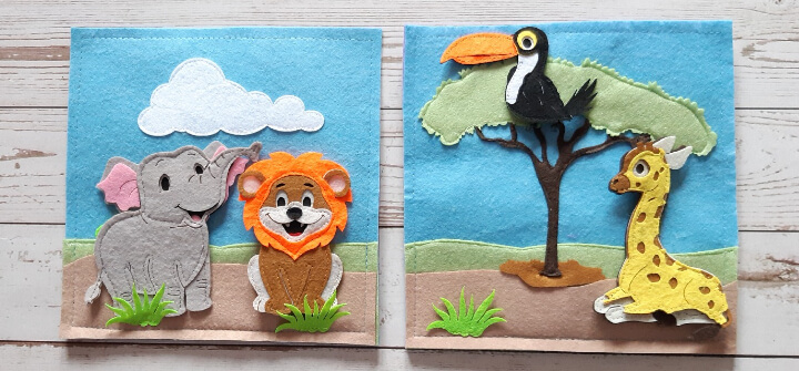 Safari svijet. Lav, slon i žirafa su lutkice za prste, tukan je povezan vezicom za najviši stepen sigurnosti – Ova stranica podstiče igru uloga i razvija dječiju maštu, dok lutkice na prste pomažu u razvoju finih motoričkih vještina. Igra uloga koristeći lutkice za prste je ključni element u razvoju dječije mašte i kreativnosti. Lutkice za prste omogućavaju djeci da stvaraju različite scenarije i priče, čime se podstiče razvoj socijalnih vještina, komunikacije, saradnje, razumijevanje emocija i empatije prema drugima.