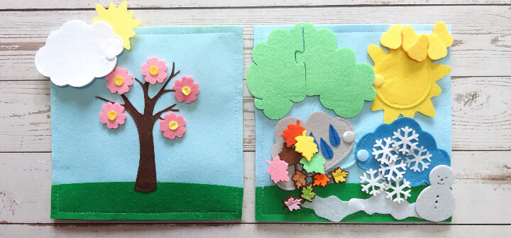 Godišnja doba – svaki oblak je u obliku džepa i predstavlja jedno godišnje doba. Cvijeće za proljeće, kruške za ljeto, lišće za jesen, te pahulje i snješko za zimu – Ova stranica pomaže djeci da razumiju ciklus prirode kroz godišnja doba, podstičući svijest o vremenu i promjenama u prirodi.