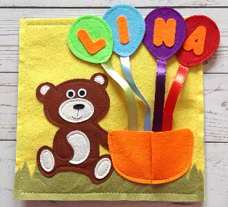 Medo sa korpom i balonima sa slovima imena djeteta – Personalizacija čini ovu stranicu posebnom, dok redanje slova pravilnim redoslijedom formirajući ime je odlična osnova za razvoj pismenosti.