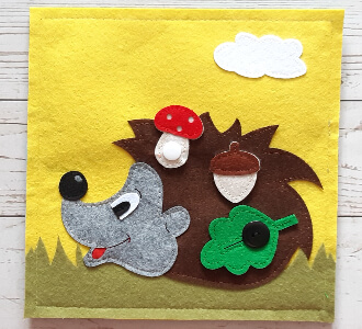 Jež sa gljivom (plastična nitna), žirom (čičak) i listom (dugme) – Djeca istražuju teksture i oblike dok se igraju sa uklonjivim elementima, što pomaže u razvoju logičkog razmišljanja i motoričkih vještina.