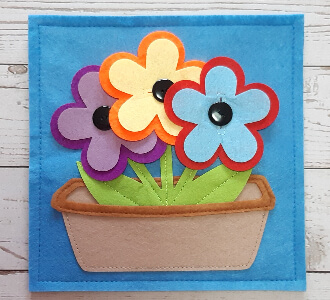 Saksija sa tri cvijeta sa dugmićima. Naučite kako zakopčati i otkopčati dugmad. Postavite cvijeće u saksiju. Koncept unutra i van – Ova stranica podstiče praktične životne vještine poput zakopčavanja, dok također razvija osjećaj za red i rješavanje problema.