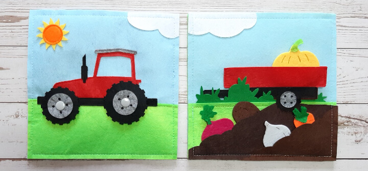 Traktor sa dva točka koji se skidaju (plastični drikeri). Prikolica se spaja za traktor sa čičkom. Ova stranica uključuje pet različitih vrsta povrća – Djeca uče o poljoprivredi, dok skidaju i vraćaju dijelove, razvijajući logiku i koordinaciju ruku i očiju.