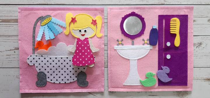 Djevojčica u kupatilu i navike lične higijene. Ormar sa češljem i šamponom, i dvije male patkice – Ova stranica pomaže djeci da razviju svijest o važnosti higijene kroz igru sa djevojčicom i njenim toaletnim potrepštinama. Djeca kroz ovo iskustvo uče kako održavati higijenu, što potiče razvoj svakodnevnih navika.