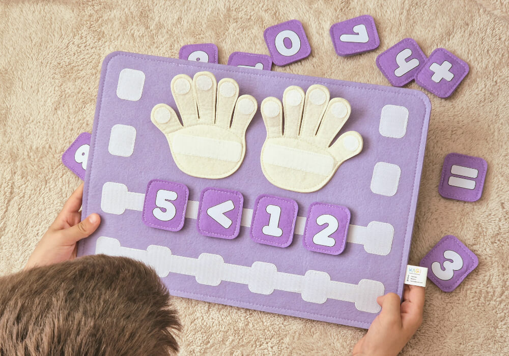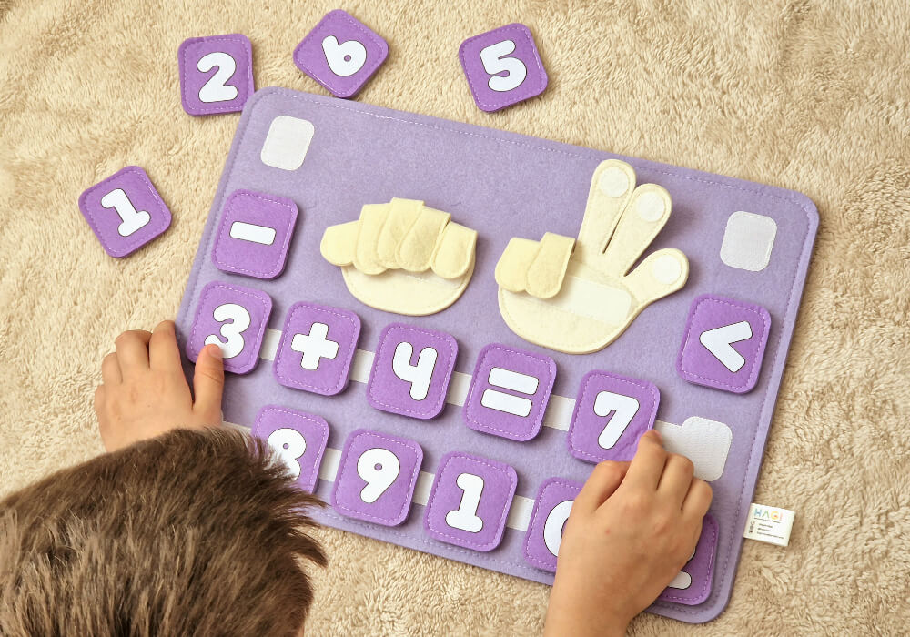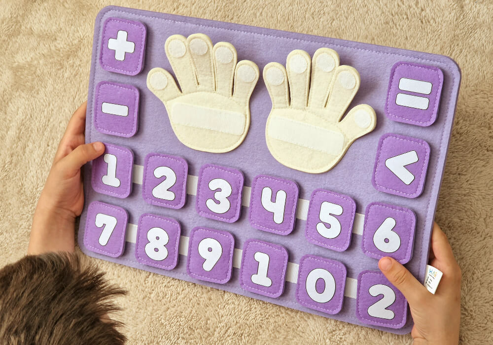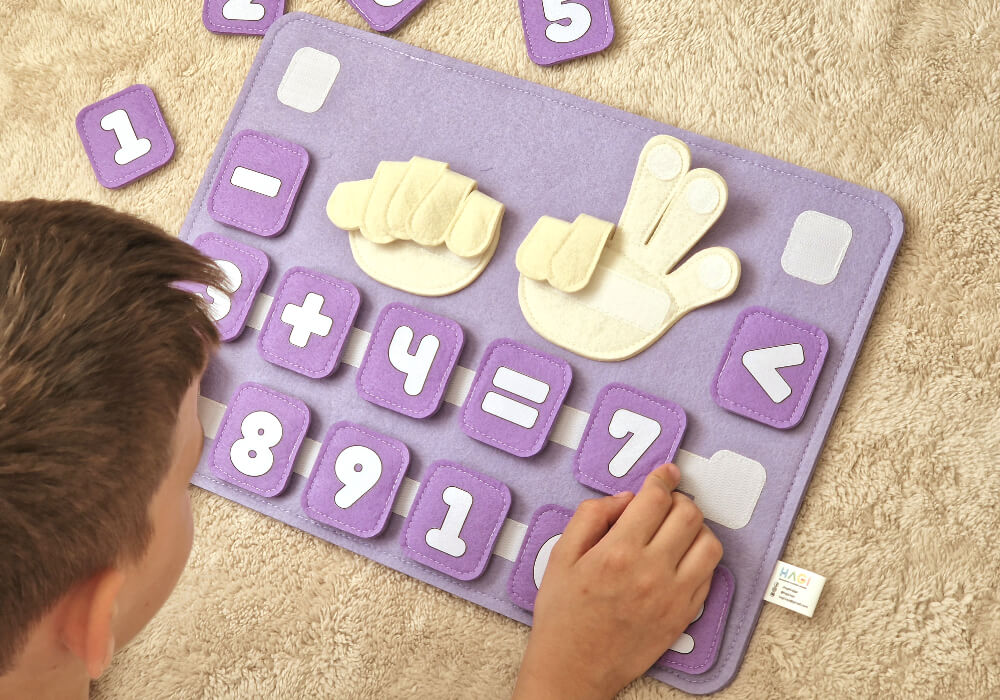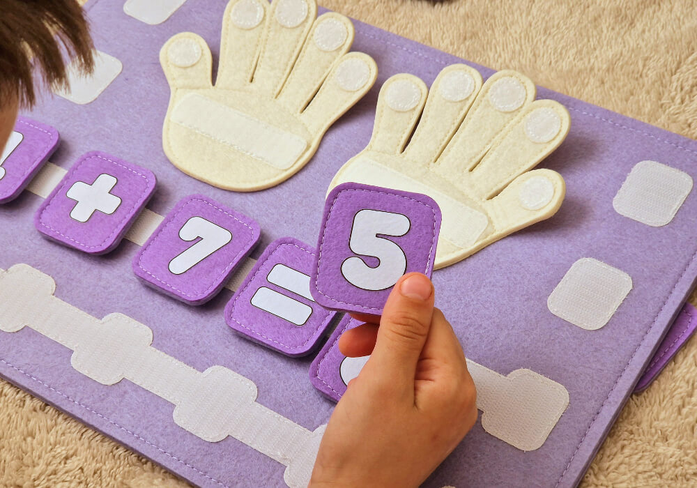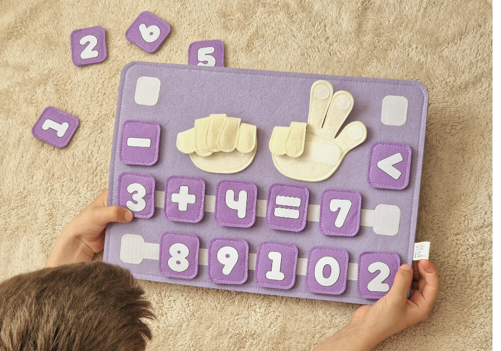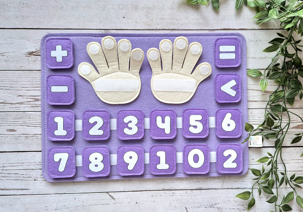 Make the first steps into the world of math fun and hands-on! The Smart Fingers Board is an educational felt toy designed according to Montessori principles, helping children grasp the basics of counting and simple math operations in a concrete and visual way.